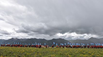 花海上、馬匹間,康巴漢子摩拳擦掌;藍(lán)天下、溪流旁,盛裝觀眾搖旗吶喊。19日,作為運(yùn)動(dòng)會的分項(xiàng)活動(dòng)之一,德差鄉(xiāng)羊格貢草原上演了一場500匹駿馬在康巴漢子駕馭下同場飛奔的馬術(shù)表演視覺盛宴。伴隨著鏗鏘有力的馬蹄聲、駿馬的嘶鳴聲和觀眾的歡呼聲,一幅集奔騰之美、力量之美、風(fēng)光之美于一體的壯美畫卷快速閃過觀眾眼簾。