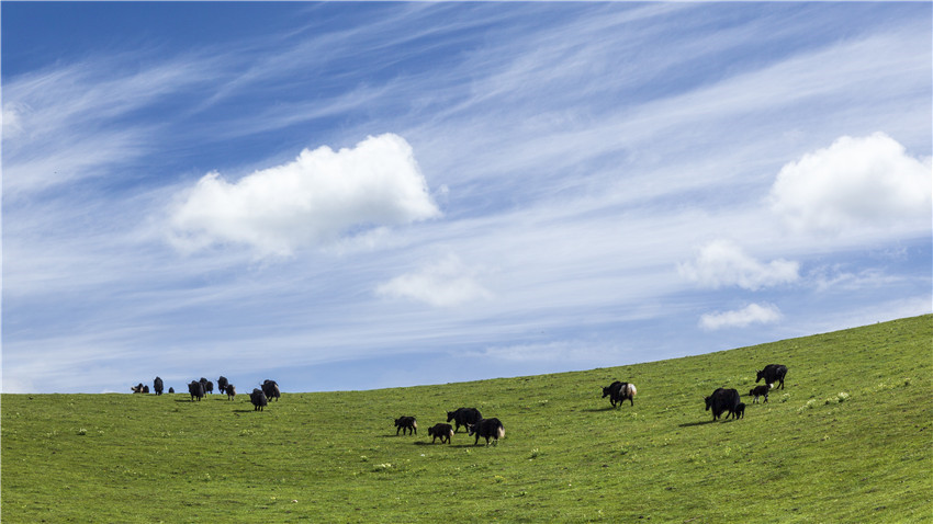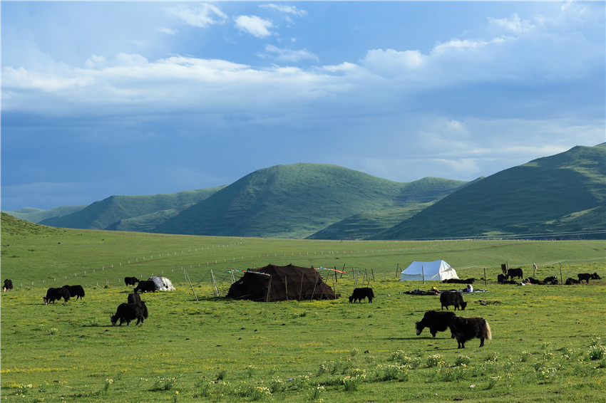 在康定,塔公草原草色青青,引得往來(lái)的游人駐足,藍(lán)天、白云、青草地,幾匹悠閑吃草的牛羊,一幅草原美景圖呈現(xiàn)在眼前,讓人流連。