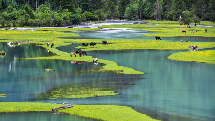 月亮湖是荷花海國(guó)家森林公園最下面的一個(gè)海子,正因?yàn)槠右挥?,也更少被人們熟知?/p>