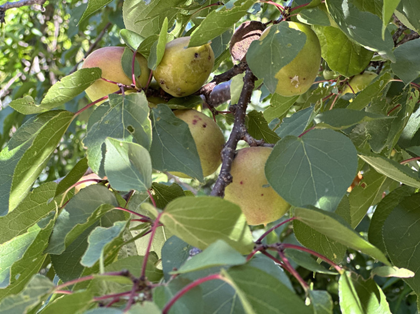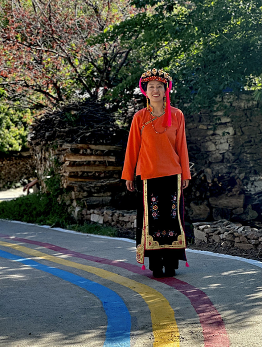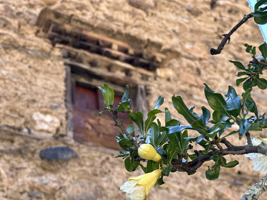 彩色鋪裝的通村路兩邊,成片的苞谷林正在背紅纓,風(fēng)中響著緊密結(jié)實(shí)的聲音。各種果木枝繁葉茂,結(jié)滿(mǎn)了寶石般紅紅綠綠的果子。一排柴垛上方,伸出很大一片橙色的小果子,沒(méi)有葉子,我們像賞花一樣欣喜于它的紅艷。嘉絨姑娘悄默地走在我們身邊,她的手里擺弄著一片草葉,安靜而美好,是感到這一路上的莊稼果木已經(jīng)足夠繁盛。