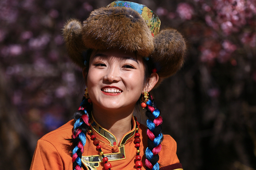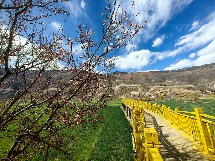 春意枝頭俏,桃花競(jìng)相開。登高遠(yuǎn)望,巍峨青山綿延,山腳麥苗蕩漾,蒼茫山色間,一株株、一叢叢野生桃花星羅棋布點(diǎn)綴其間,加之一棟棟別致藏房掩映其中,春的美麗畫卷就此鋪展開來。