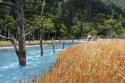 這里森林茂密,河流縱橫,生態(tài)原始,很多古樹浸泡在河水、沼澤之中,姿態(tài)怪異,神秘莫測,猶如置身侏羅紀(jì)時代。傳說這里是東巴神話《創(chuàng)世紀(jì)》的發(fā)祥地。