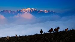 地處瀘定、天全、榮經(jīng)三縣交界的二郎山紅巖頂是與牛背山天然觀景臺(tái)隔山相望的又一處云海奇觀觀景臺(tái)。這里與牛背山、貢嘎山成崎角遙遙相視;松柏林立、杜鵑滿坡、駿馬閑遛,草甸翠綠;移步亦景,美景誘人,讓人留連忘返,心曠神怡…………