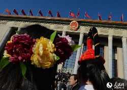3月5日,第十二屆全國人民代表大會第二次會議在北京人民大會堂開幕。云南少數(shù)民族代表在進入會場前合影留念。中新社發(fā) 駱云飛 攝