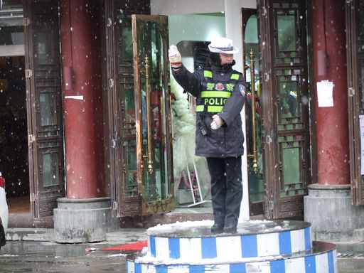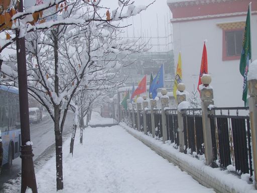 康定秋意正濃,河岸的楊柳還未泛黃,卻意外地迎來了一場不期而遇的降雪,也是今冬康定迎來的第一場雪。大片的雪花輕盈落下,康定城和跑馬山一片銀裝素裹,分外妖嬈。13日早上,康定城依然下著鵝毛大雪。這場深足30厘米的雪,使入冬以來一直持續(xù)的干燥空氣變得濕潤,雪景美不勝收,但也給人們出行帶來許多不便。記者在街道上看到車流量和行人明顯減少,機(jī)動(dòng)車都放慢了速度,以確保行車安全。上學(xué)的學(xué)生,上班的人群都都裹上了厚厚的冬裝,小心翼翼地行走在雪地上。交警依然堅(jiān)守在紛飛的風(fēng)雪中指揮交通;環(huán)衛(wèi)工人和一些單位職工迎著大雪清掃馬路和庭院積雪。記者提醒司機(jī),雨雪天氣謹(jǐn)防交通事故,行人要注意因雨雪路面濕滑,謹(jǐn)防摔傷。