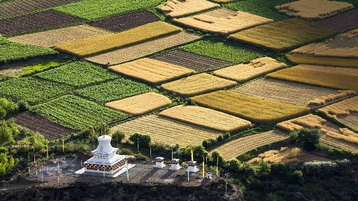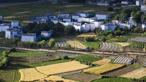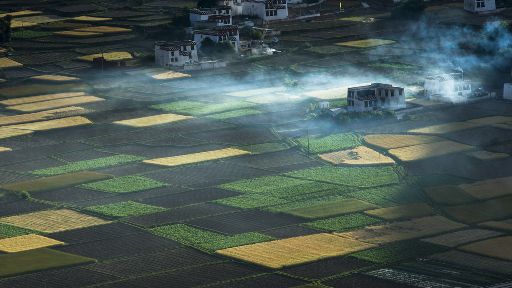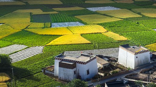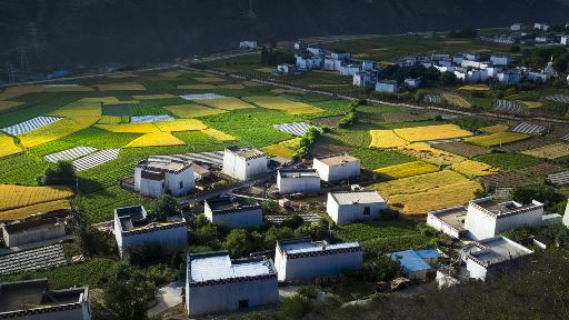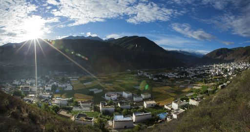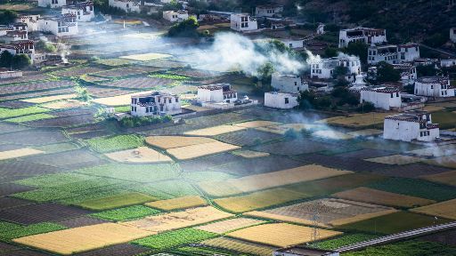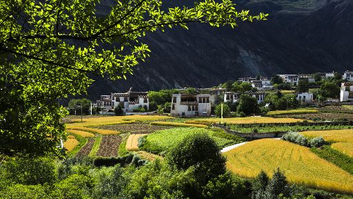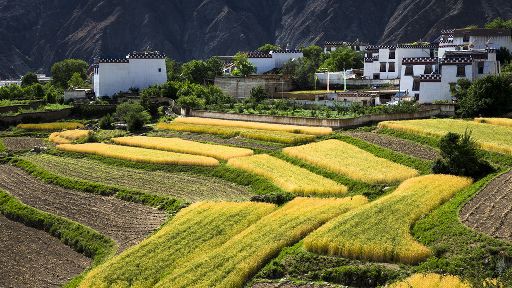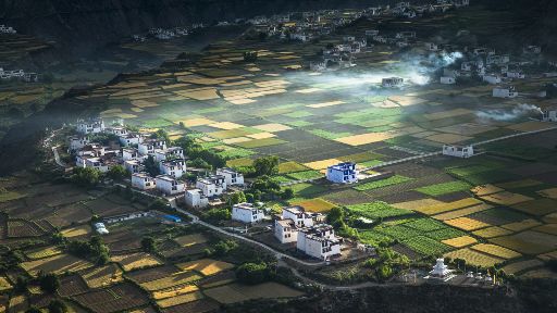 清晨,瓦藍瓦藍的天空云霧繚繞,周圍的景物一片朦朧,就好像童話里的仙境,一會兒,太陽從東邊冉冉升起,霧也漸漸消失,村子里屋頂上飄著裊裊煨桑的煙子,我站在山岡上從高處向下俯望,只見高山峽谷之中,層層翠綠的梯田簇擁著鄉(xiāng)城特有的白藏房,山下的田野,就像一片金色的海洋,將秀麗的田園裝扮得更加如詩如畫。一陣晨風(fēng)吹過,麥田上蕩起了一道道金色的波紋,遠處傳來了畫眉鳥的歌聲,我被眼前的一切迷住了,仿佛一切都靜止了,她讓我的夢從這里開始。