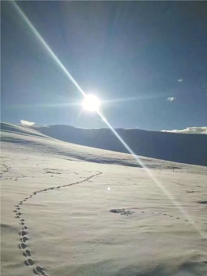 深入高山,偶然發(fā)現(xiàn)一路動(dòng)物經(jīng)過的痕跡,就像是追逐著太陽向更高更遠(yuǎn)走去。誠然,若不是現(xiàn)代文明的不斷進(jìn)步,要生活在這里是不易的,因?yàn)槎┑木鞈俸筒簧幔屧ㄔ谝荒昀锞陀虚L達(dá)近半年的時(shí)光與雪相伴?;蛟S是因?yàn)楝F(xiàn)代科學(xué)技術(shù)克服了嚴(yán)寒,或許是因?yàn)檫@里有無出其右的白雪美景,或許是因?yàn)閷?duì)圣潔之地的崇拜,才讓扎溪卡兒女千百年來在這里扎根,在這里生存、繁衍,不斷傳承、生生不息。
