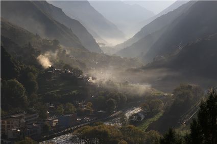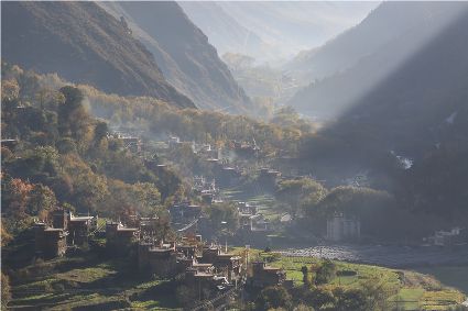 落日將最后一道霞光在山尖劃過,暗夜便裹挾這寒意搖動(dòng)起山林中的樹木。風(fēng)漸緊,那已經(jīng)稀稀落落的樹葉隨著風(fēng)的韻律,跳起歡快的鍋莊,仿佛在告別這一年的繁華。突如其來的大雪,給丹巴的二月涂上白色的記號。從山尖到院前的樹上,一溜兒雪白,正應(yīng)了“忽如一夜春風(fēng)來,千樹萬樹梨花開”的情景,讓人忍不住伸出手指看看這花是真是假。大雪過后,陽光如約而至撒滿藏寨,金色陽光和蒸騰的白霧縈繞在雪白的山頭,與山下的古碉藏寨,河畔的清流巧妙地構(gòu)成一幅絕美畫卷,讓人仿佛身處仙境。吸足了養(yǎng)分的柳樹終于抽出綠芽送來春天的信號,那柳條兒在細(xì)風(fēng)吹拂下宛如少女對鏡梳妝,在陽光下顯得無比溫柔,讓人不禁想貼近它們,感受這溫暖又靜謐的溫柔。