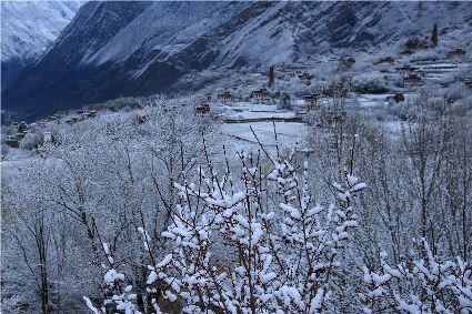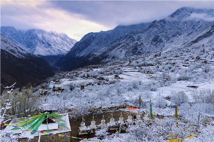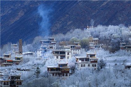 突然,耳畔傳來了誦經聲。山坡下的平臺上,是一排白塔。白塔的周圍,掛滿了經幡。早起的誦經人,沿著中路藏寨的小路來到白塔,一邊轉白塔,一邊虔誠誦經。一年四季的地區(qū)稱春雨貴如油,那么旱雨兩季的地區(qū)該怎么贊美春雪呢?怕是該稱為春雪貴如金了。祈愿吧——一年好時節(jié),又是一個豐收年!