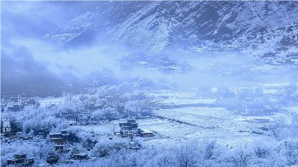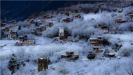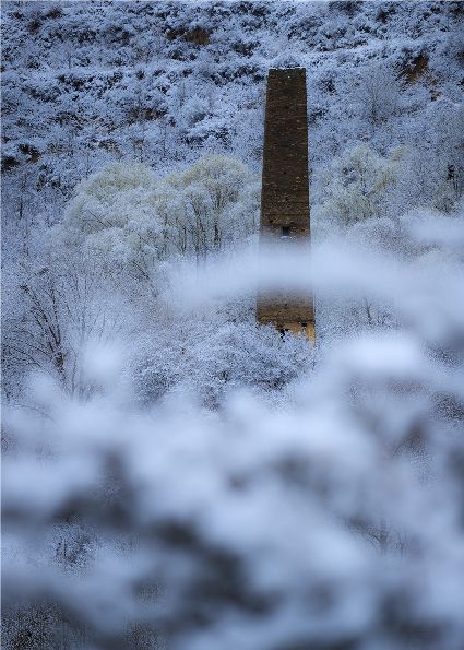 我以這份孤獨和執(zhí)著,爬上了東邊的山坡。雪停了,微風習習。櫻桃花、桃花在雪枝頭冷艷,淡淡的幽香徐徐浸入心扉。滿眼望去,一片晶瑩,一片潔白。古碉藏寨在這片世界里,寧靜安詳,不容一絲一毫的驚擾。我懷疑自己進入了那種叫做空靈的境界。