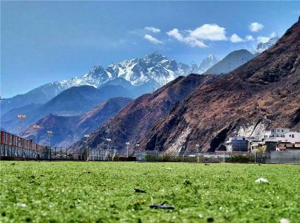 天空像剛被浸染的綢緞,蔚藍(lán)的主色已經(jīng)略顯;白雪好似從浸染的綢緞上滴落下的顏料與其它顏色的混合,眷戀的駐足在山尖,在其耳旁?xún)A訴來(lái)年的約定;一顆顆萬(wàn)年青穩(wěn)穩(wěn)的站立,將山中的寺廟、亭閣緊緊地包圍,見(jiàn)證著康定四季輪回的變化;依然披著秋冬贈(zèng)予黃色外衣的樹(shù)木,拋開(kāi)桎梏,堅(jiān)守在一座座樓房旁。藍(lán)與白,黃與綠……這大美的晴天為人們帶來(lái)了別樣的視覺(jué)盛宴。