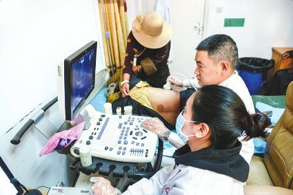 石渠縣德榮瑪鄉(xiāng)衛(wèi)生院醫(yī)務(wù)人員正在對(duì)當(dāng)?shù)厝罕娺M(jìn)行包蟲病B超篩查。