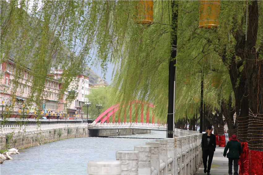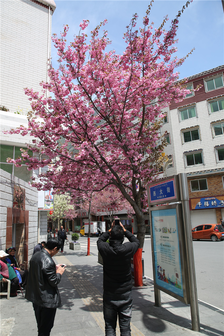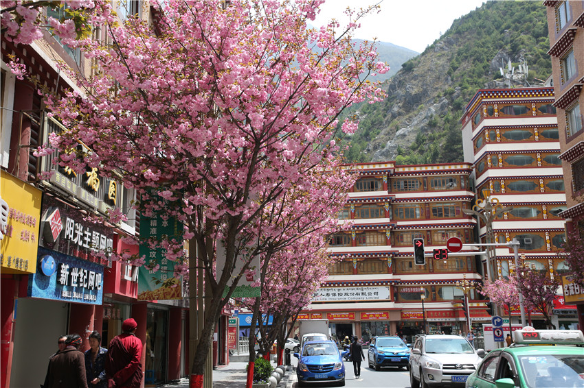當(dāng)春天遇見(jiàn)最美的櫻花時(shí),驚艷了整個(gè)康定。櫻花與身邊人都將成為春日里的浪漫風(fēng)景。櫻花之美,美在氣勢(shì),櫻花紛飛,夢(mèng)幻唯美。每年4月中旬,康定城北門的櫻花綻放后,人們像是約好了一樣聚集到這里,共赴這一場(chǎng)甜美盛宴。這一路繁花似錦,人們穿過(guò)枝椏花正盛的櫻花林,穿過(guò)粉色海洋,徑直奔向一個(gè)浪漫的童話,一路櫻花飄散,一路粉光燦爛。櫻花絢麗繽紛、陸續(xù)綻放,若恰逢一陣春風(fēng)經(jīng)過(guò),櫻花瓣隨風(fēng)舞動(dòng),猶如紛落的雪花,空氣中浮動(dòng)著櫻花特有的淡淡香氣,令人不禁懷疑自己置身夢(mèng)境?!翱刀ǖ拇禾靵?lái)得要晚一些,綻放的櫻花,滿街的花草,折多河畔楊柳依依,康定的春天無(wú)比驚艷,醉了游人。”周先生一邊拍照,一邊感嘆,他在康定生活了40多年,20年前的康定,可以說(shuō)找不到像樣的花草樹(shù)木,進(jìn)入新時(shí)代,康定城市變美了,城市綠化走在了前面,城市的美譽(yù)度舒適度不斷提升??刀ㄖ?,春色滿園,姹紫嫣紅,風(fēng)光旖旎。