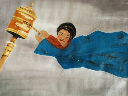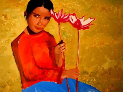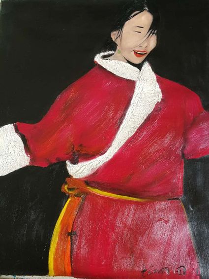 畫畫三年多了。十三歲寫詩;到了高原后,方開始創(chuàng)作長篇小說。在上海,我做過畫廊。但要說斗膽動筆畫幅肖像。我是在白度母唐卡前燃了三炷香的。包括在咖啡店現(xiàn)場作畫。到京城繼而國外辦畫展,我認(rèn)為都是因了我把畫布當(dāng)成了詩稿的緣故。于是,大家喜歡我這種野路子,天馬行空,可又不舍方圓的創(chuàng)作手法。接下來,歐洲、東京還會有我的系列展覽。
