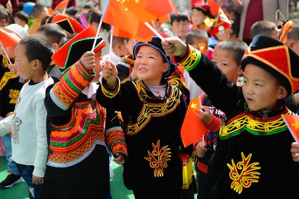 “六一”前夕,我肩挎相機(jī)走進(jìn)了熱鬧非凡的九龍縣二幼,他們正在舉行“我們在一起”文藝活動(dòng)?;顒?dòng)一開始,幾個(gè)四五歲的小小升旗手,身著民族服裝在老師的口令下莊重地走上旗臺,在激昂的國歌聲中,國旗在他們手中冉冉升起,全場行注目禮。這場景令我感動(dòng)不已,國家強(qiáng)盛,人民安康,孩子們在溫暖的陽光下茁壯成長。