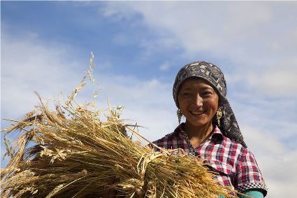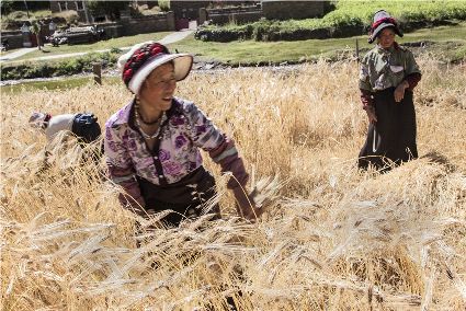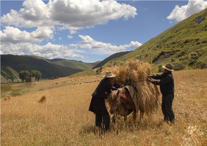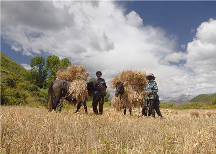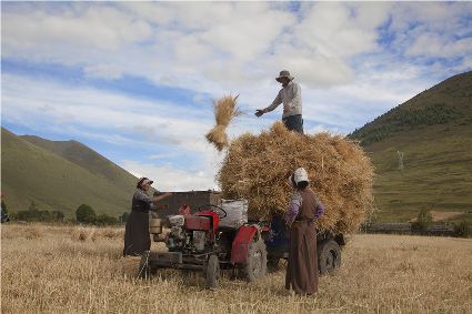 八月起迄,當(dāng)你翻越西出爐關(guān)第一隘口的折多山,下山十里就會看到山地田野里成熟的青稞、麥子象展開一頁頁金黃的詩篇涌進(jìn)眼里。那大地山坡起伏驛動的金箔等待著走進(jìn)主人的碉樓……這個(gè)時(shí)候,正是秋收的開始。