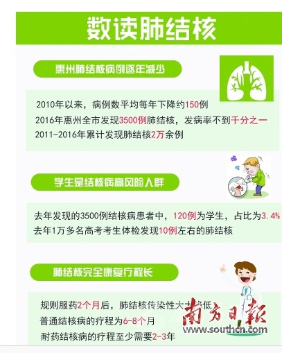 惠州市第一人民醫(yī)院健康管理中心主任彭可同樣為這一論斷提供了數(shù)據(jù)支撐。該院長期以來負責惠州市直高中的高考體檢工作,據(jù)彭可透露,肺結(jié)核是高三學生在體檢中檢出異常最多的病癥,2016年共有1萬多名考生由該院組織體檢,其中發(fā)現(xiàn)10例左右的肺結(jié)核。