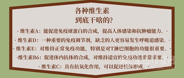 維生素A能促進免疫球蛋白的合成,提高人體感染和抗腫瘤能力;維生素A還能消除免疫耐受。影響免疫反應(yīng)的各種細(xì)胞因子也可能在維生素A缺乏時發(fā)生改變,從而影響體內(nèi)抗原-抗體反應(yīng)。