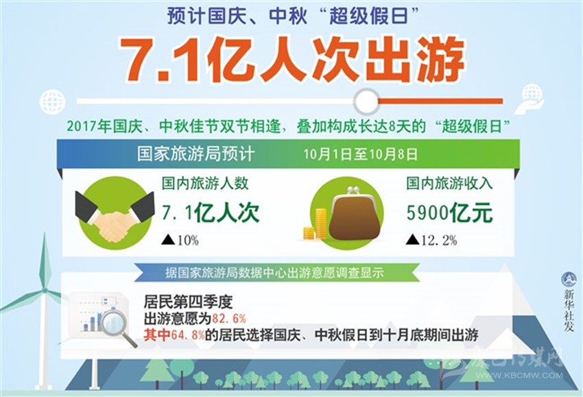 今年國(guó)慶、中秋佳節(jié)雙節(jié)相逢,疊加構(gòu)成長(zhǎng)達(dá)8天的“超級(jí)假日”。國(guó)家旅游局預(yù)計(jì),10月1日至8日國(guó)內(nèi)旅游人數(shù)將達(dá)到7.1億人次,國(guó)內(nèi)旅游收入將達(dá)到5900億元,較去年同期分別增長(zhǎng)10%和12.2%。