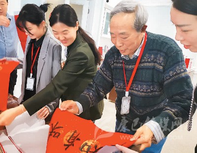 星堡香山長(zhǎng)者公寓的住戶李爺爺在展示他和朋友們一起寫(xiě)的對(duì)聯(lián)。