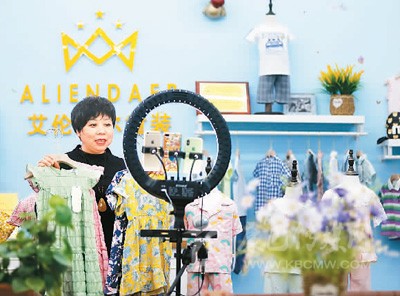 5月15日,位于山東省青島市即墨區(qū)的青島艾倫達爾服飾有限公司營銷人員通過云直播推介產(chǎn)品。