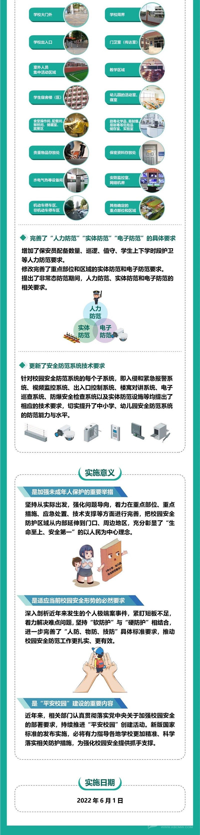 《要求》的突出亮點(diǎn)是,明確安全防范的重點(diǎn)部位和區(qū)域。堅(jiān)持以“生命至上、安全第一”為中心理念,結(jié)合近年來國家和相關(guān)部門對(duì)中小學(xué)、幼兒園安全防護(hù)工作的系列部署以及校園的不同類型、規(guī)模,明確了安全防范的16個(gè)重點(diǎn)部位和區(qū)域,把校園安全防護(hù)區(qū)域從內(nèi)部延伸到了門口、周邊地區(qū)。