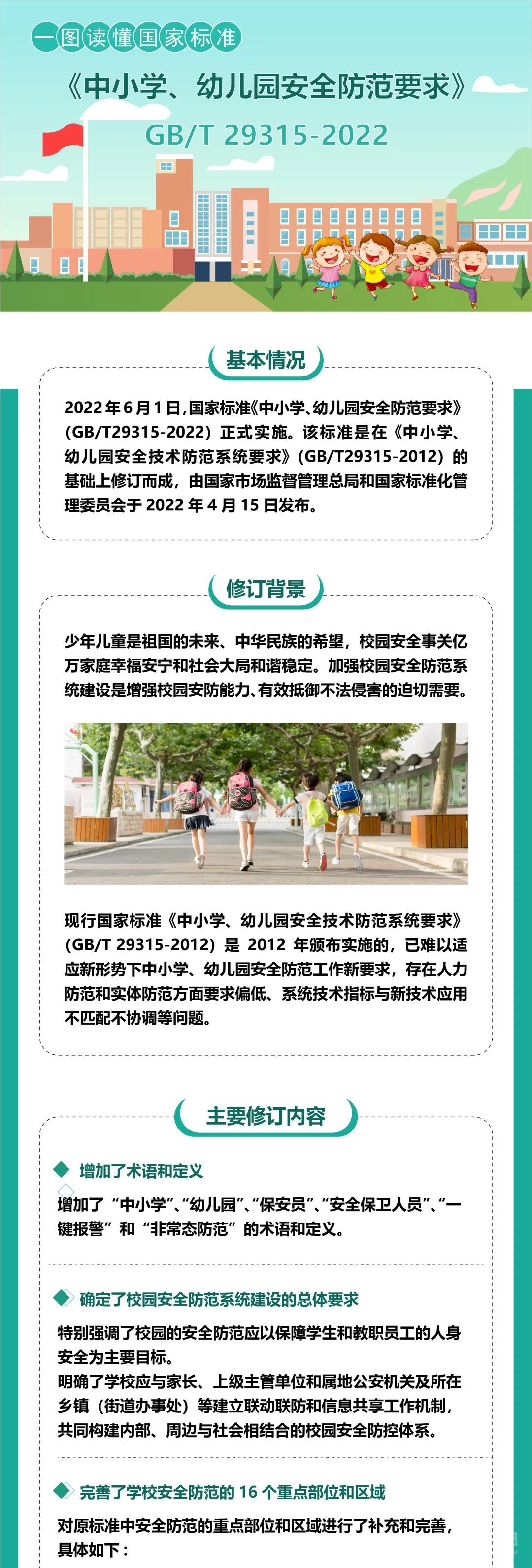 據(jù)市場(chǎng)監(jiān)管總局消息,近日,《中小學(xué)、幼兒園安全防范要求》(GB/T 29315-2022)(以下簡稱《要求》)經(jīng)市場(chǎng)監(jiān)管總局(標(biāo)準(zhǔn)委)批準(zhǔn)發(fā)布,將于2022年6月1日起正式實(shí)施。