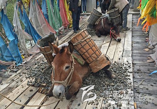 這是318和317國道都不通過的甘孜州白玉縣,從白玉縣城通往建設(shè)鄉(xiāng)德沙村的路是一條木制棧橋,2014年5月4日的中午,兩頭騾子在300斤石料的重壓下踩斷了中間的橋板,兩條前腿從踩碎的木板處懸著,騾子發(fā)出粗壯的喘息聲,無法掙扎,不能動(dòng)彈。棧橋上有路過的藏民,手中旋轉(zhuǎn)著轉(zhuǎn)經(jīng)筒,他口中念念有詞:騾子啊,你還沒有得到解脫。一群來自外地的游客都很驚詫。 騾子運(yùn)輸隊(duì)的王玉海,在過往行人和同行的騾隊(duì)鄉(xiāng)親的幫助下,先卸下騾子身上背負(fù)的碎石,然后手伸到騾子前腿根處,用力抬起騾子的前身。在查看騾子沒有受傷后,王玉海把這兩只騾子牽到騾隊(duì)最后面,然后,引著另外5只負(fù)重的騾子,從橋靠左邊的雙層木板橋面上通過,騾子隊(duì)受到驚嚇,不愿意上橋,王玉海安撫了一會(huì)兒騾子隊(duì)后,在同伴的協(xié)作下,前面牽引,后面驅(qū)趕,終于,王玉海的7只騾子過橋,其他8個(gè)同伴的50多頭負(fù)重的騾子也一一通過。