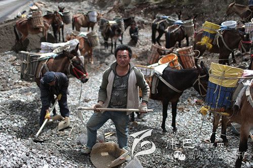每天早上6點(diǎn)多,王玉海和同伴趕著騾子隊(duì),從白玉縣縣城旁邊的住地步行約1小時(shí)到達(dá)德沙村,約8開始從離索道橋約300米的路邊沙石場裝運(yùn)碎石。他們通常工作到下午5點(diǎn),每只騾子在海拔3000米左右的高度,來回運(yùn)送20次左右,每只騾子運(yùn)輸碎石大約在3000公斤左右。這些騾子正當(dāng)強(qiáng)壯年,年齡大約在三四歲,通常在坡度在30度以下的,最大負(fù)重約800斤。