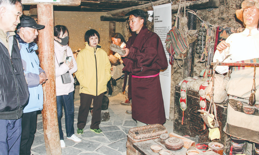 漫步在理塘縣的勒通古鎮(zhèn)·千戶藏寨,石頭墻壁上印著的是詩人倉央嘉措的浪漫情詩墻繪。木制門窗古色古香,上方頂著的是“藏戲微博物館”“康巴人微博物館”“黑陶和編織微博物館”等招牌。推開康巴人微博物館的大門,映入眼簾的一件件逼真的蠟像,還原了擠牦牛奶、打酥油茶、釀青稞酒等不同場景。人物的銀發(fā)也被特意染成不同層次的白色,更添幾分真實感。