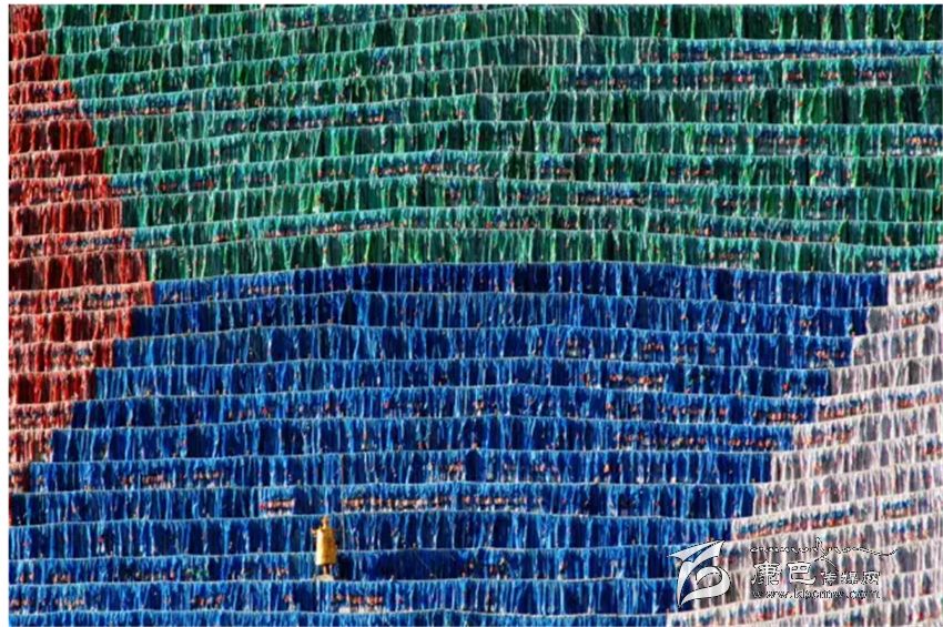 各種顏色的經(jīng)幡組成了六字箴言的第一個(gè)字“嗡”掛在山上,面積約有100多平方米,可以與拉薩大昭寺的大唐卡相媲美!