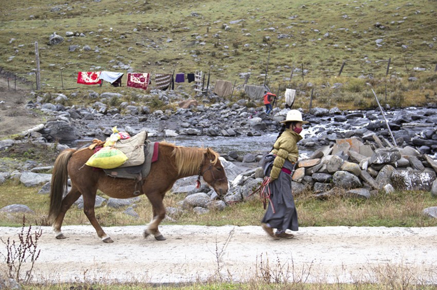 莫斯卡的女人或在寺廟點(diǎn)酥油燈,或帶孩子,或牽馬牧草,或在溪邊淘衣,或出門打水……她們的勤勞和樸實(shí)滋養(yǎng)著莫斯卡,滋養(yǎng)著莫斯卡的生命。她們用黑、紅、綠那樣跳躍的顏色搭配出獨(dú)具風(fēng)格的服飾,背著你遠(yuǎn)去,又迎著你走來(lái),她們美麗的背影裝扮了寂靜的莫斯卡小巷。