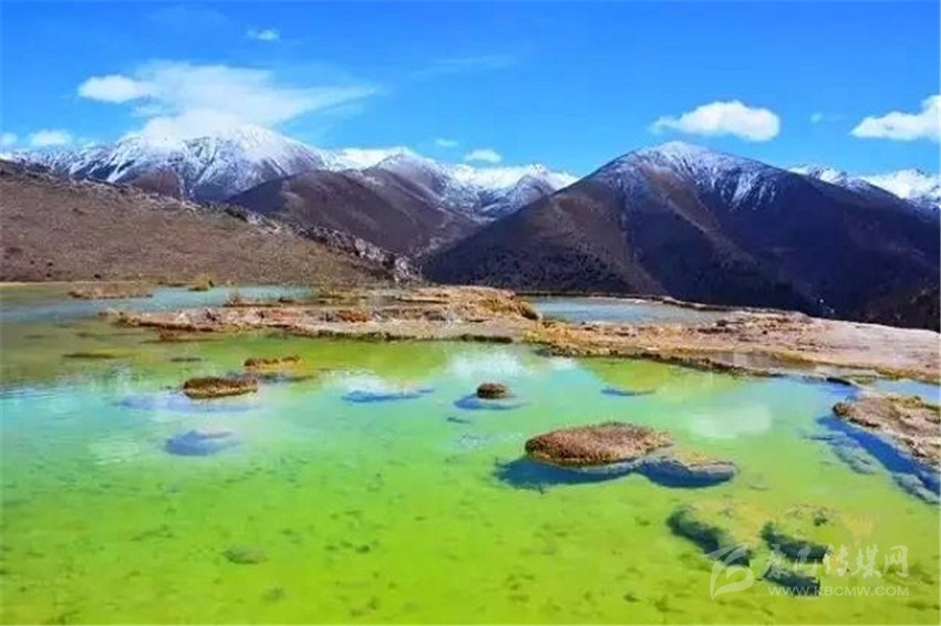 泉華灘海拔約4000米,屬于高山河谷草甸地貌。東南面就是貢嘎山,這里是觀看“蜀山之王”的絕佳位置。它因一種含有大量化學(xué)物質(zhì)的泉水在地表產(chǎn)生化學(xué)沉淀而成,從另一個山頭傾斜下來大片的白色鈣化土,延伸到谷底后便變化出四層五彩的鈣化池。每個階地上有十幾個大小不同、形態(tài)各異的五色彩池,水深40-70厘米,彩池里水草相依,石花點(diǎn)點(diǎn),疑為瑤池降臨人間!