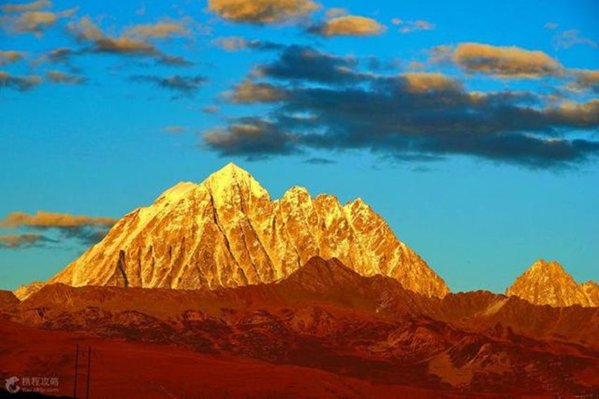 貢嘎山位于康定城南約55千米處,“貢嘎”為藏語“雪白”之意。貢嘎山險峻挺拔,峰項有70平方米的平臺,終年積雪覆蓋,晴空萬里時,閃耀著熠熠光芒,瑰麗壯觀。