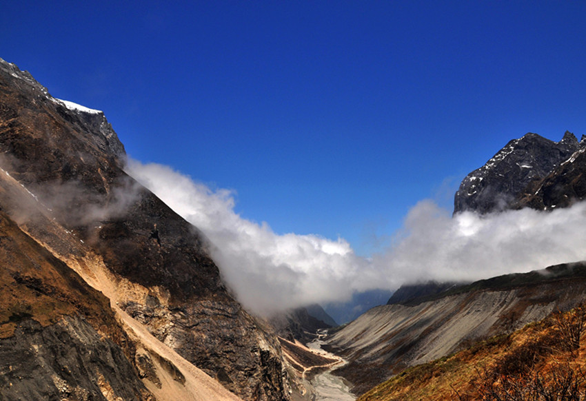 第二天,我們準(zhǔn)備游玩燕子溝,醒來的第一件事就是拉開窗簾看看天氣,又一陣興奮,天氣依然非常晴朗,今天是進(jìn)燕子溝的第一天,我早做足了準(zhǔn)備,太陽帽、墨鏡、食品等等一樣不少。從磨西到燕子溝溝口的路程很長,需要坐景區(qū)的觀光車,因?yàn)樘鞖獾脑?,山上只有少些云霧繚繞,環(huán)在山腰,仿佛是一幅山水畫景。我們先來到了冰窖口,這里的海拔有三千多米,所幸大家都沒有高原反應(yīng),后坐車下山,來到有“定海神針”之稱的一棵高大筆直的杉樹。這棵杉樹皮粗厚,已經(jīng)沒有了樹葉,樹枝也寥寥無幾,更顯滄桑。站在樹下遙望,顯得人是那么渺小。不禁讓人遐想這顆千年古樹的滄桑歷史。然后開始步行游玩,這里海拔比較低,走 起來不是很累,在城市中見慣了高樓大廈,車水馬龍的我們,此刻真有一種離開凡塵,來到世外桃源的感覺,我們一路依山而上,越走越高。我們終于來到了天藥水坪,這里的景色已經(jīng)完全不同于山下,看著遠(yuǎn)處的山,我們都不約而同地“哇”了一聲。
