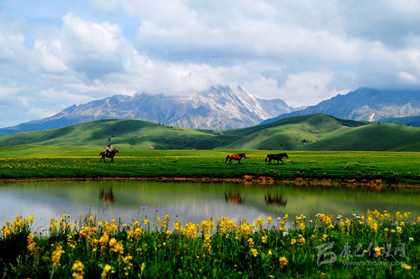 夕陽照耀湖水,閃著金銀光;綠樹撐著青天,到處莽蒼蒼;牧民家的房子,五彩斑斕樣;藍色天空之上,白云在飄蕩;青石河岸之畔,繽紛百花香……這里是寫生的圣殿,這里有攝影的天堂,這里是讓人魂牽夢縈的夢里仙鄉(xiāng)。