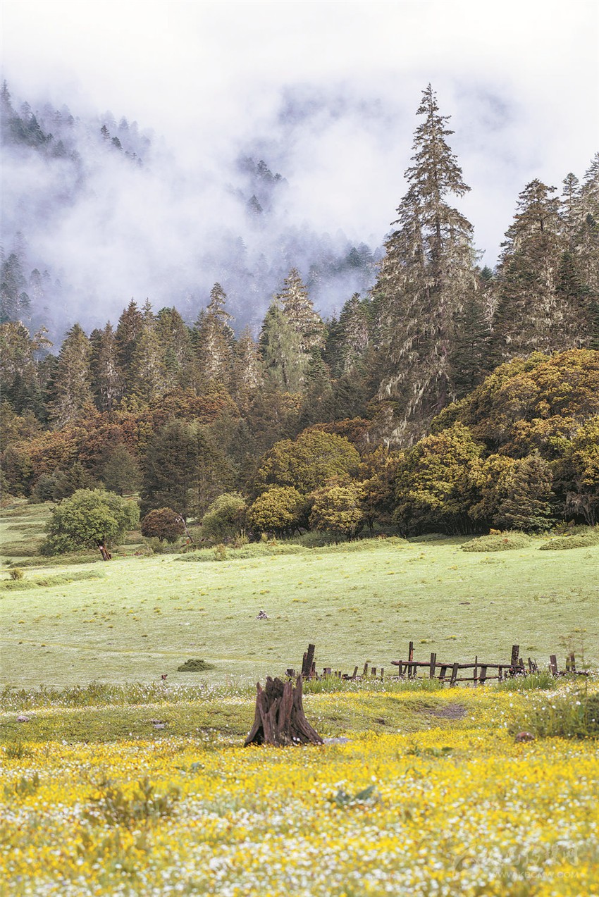 置身于雪山、湖色與草色,陽光精確地照在一棵金色的樹上,樹的光亮奪目與遠(yuǎn)處云霧繚繞的暗山形成反差,如夢如醉。