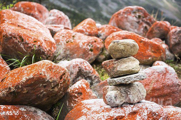 紅石灘的神奇之處并非因?yàn)槭瘔K因?yàn)楦缓撤N元素而呈現(xiàn)紅色,而是附著在石頭表面的紅色苔蘚。這種苔蘚據(jù)說(shuō)只生長(zhǎng)在海拔3000米之上的地方。