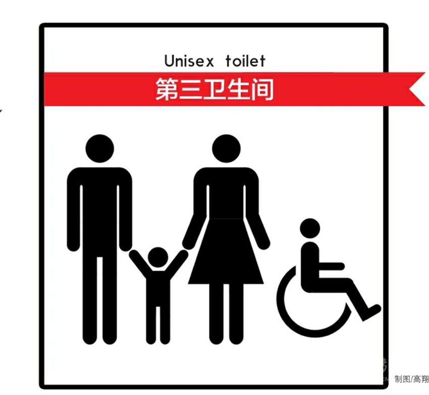 值得一提的是,四川的第三衛(wèi)生間還將有標(biāo)示。《通知》顯示,該標(biāo)示上畫著一對夫妻牽著孩子,旁邊還有一個(gè)坐著輪椅的行動不便者。在畫面下方,注明了“第三衛(wèi)生間”字樣,英文“Unisex toilet”意為“無性別廁所”。 (據(jù)四川在線)