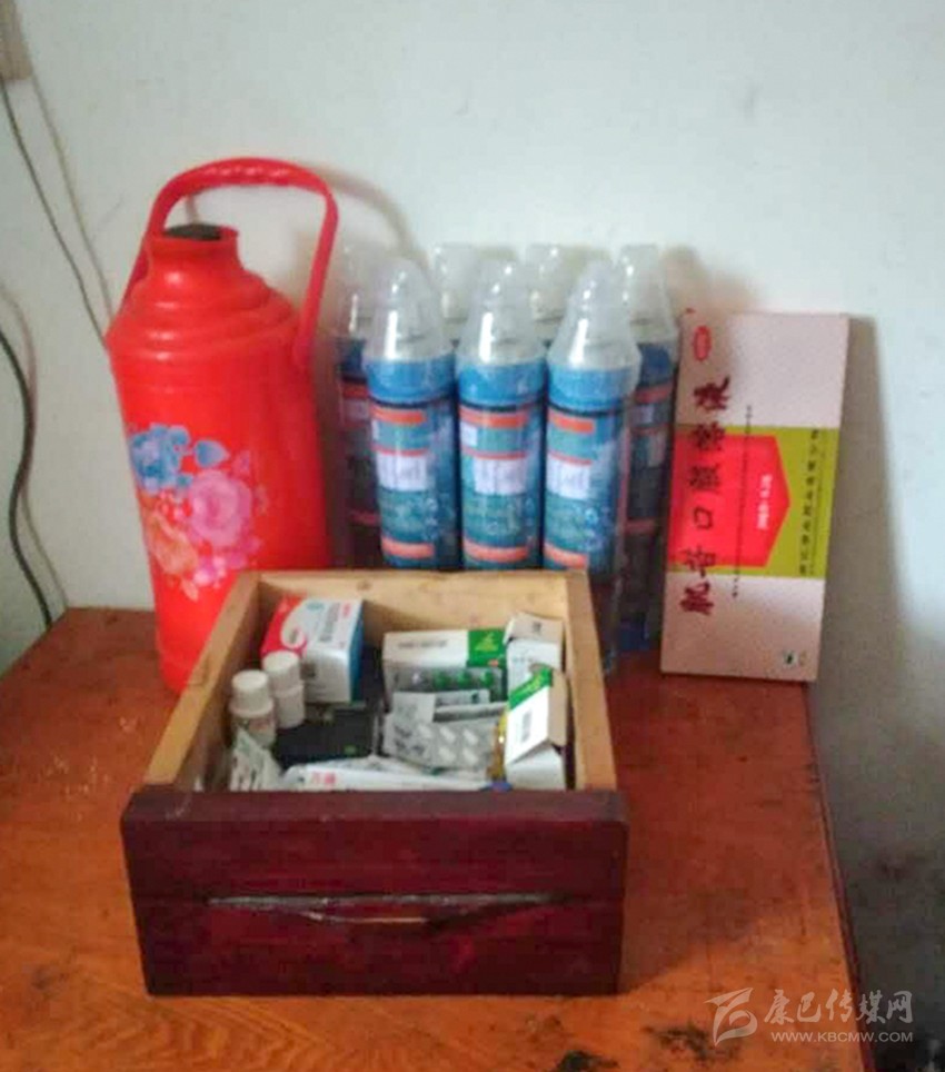 貢布卡公路養(yǎng)護(hù)管理站為游客準(zhǔn)備的開水、氧氣瓶及藥品。