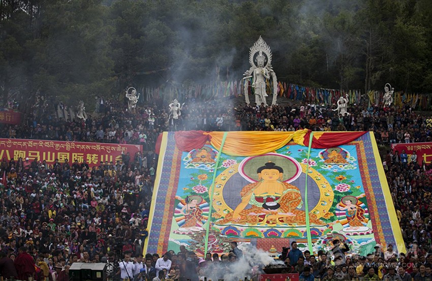 農(nóng)歷四月初八是釋迦摩尼的誕辰,這一天也是以藏傳佛教為主要信仰的康定人的重要日子。就連周邊地區(qū)的藏民也全部盛裝趕來。每逢這天,民眾自東關(guān)出、上跑馬山,寺廟的喇嘛們抬出巨幅唐卡畫卷曬佛,在法號聲聲中,眾人禮佛朝拜。在熱鬧的歌舞表演之后,再沿公主橋下,轉(zhuǎn)金剛寺、南無寺,沿阿里布果轉(zhuǎn)山步游道至子耳坡返回,轉(zhuǎn)山一圈,繞城一周,誦佛萬變,以紀(jì)念佛祖誕辰,并祈禱吉祥安康。