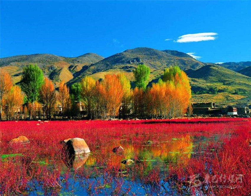 10月的紅草灘一片通紅,好像水面上在燃燒一樣,沒有草的水面將藍天白云倒映其中,背景又是一排排金黃色的楊樹林,結合在一起就構成了這里如夢般五彩斑斕的世界。