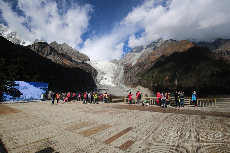 游客陶醉貢嘎山。