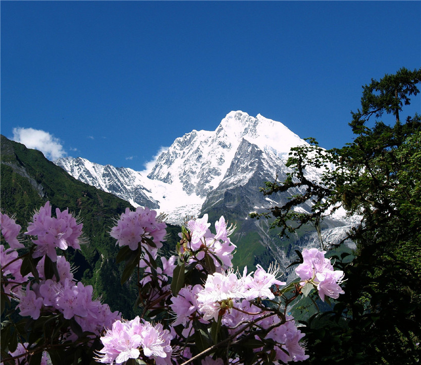 從海螺溝翻越雅家埂到康定的道路兩旁有很多品種的杜鵑花,埡口海拔1000米下生長的杜鵑花樹高大,以緋紅色、粉紅色、紫色為主。海拔越高,花樹越矮,從山頂?shù)缴窖恢变佒氖前咨幕ǘ?,像是交織在山野的白花地毯?/p>
