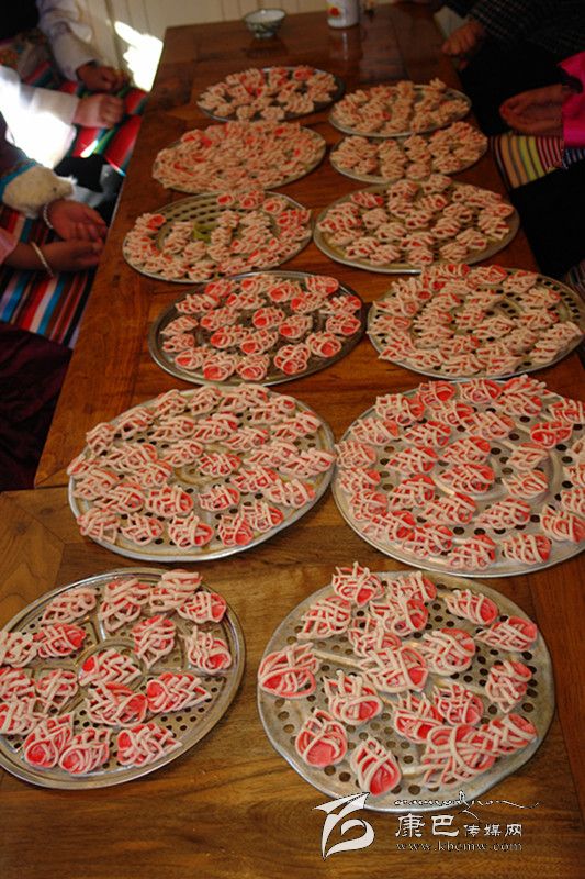 “花茹”是一種用面粉制作的糕點(diǎn),是巴塘人逢年過節(jié)、婚禮慶典等節(jié)慶日不可或缺的美食佳肴,可以這樣說,在節(jié)日期間或宴請(qǐng)賓朋之日,在眾多的糖果糕點(diǎn)中,如缺少了“花茹”,便自然就失去了巴塘風(fēng)味。