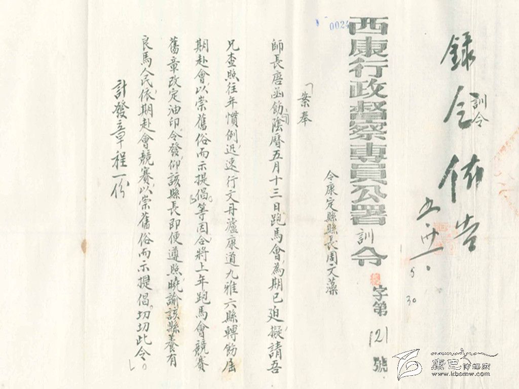 康定城各民族雜居,各種民族文化相融,形成了康定特有的民俗、風(fēng)俗?,F(xiàn)在已經(jīng)不可能見到的“郭達(dá)將軍廟會(huì)”和每年“四月八轉(zhuǎn)山會(huì)”期間在康定城郊舉辦的“賽馬會(huì)”,這些屬于康定特有的民俗風(fēng)情,在民國(guó)時(shí)期曾經(jīng)盛況空前。舉辦“郭達(dá)將軍廟會(huì)”,警察要出來維持秩序。這份賽馬簡(jiǎn)章特指1940年“四月八轉(zhuǎn)山會(huì)”時(shí)的一次賽馬。據(jù)《甘孜州志》記載:在1940年的5月,由于有“康定、瀘定、九龍、丹巴、道孚、乾寧”騎手參加賽馬活動(dòng),才制定了這份“新簡(jiǎn)章”。