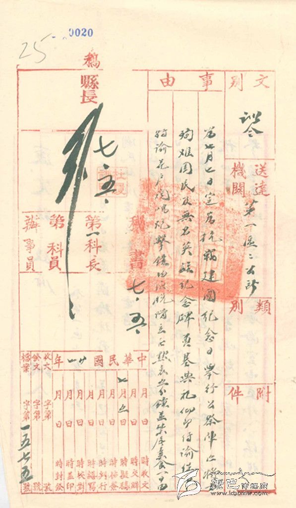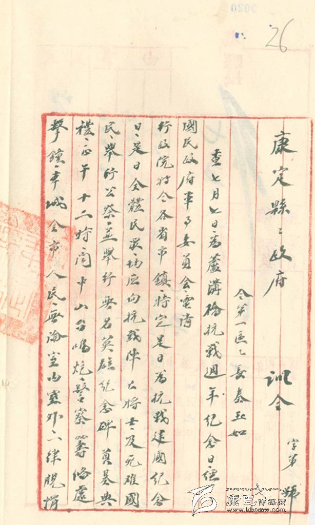 民國27年,即1838年7月5日,康定縣政府縣長杜履謙發(fā)出“訓(xùn)令”,內(nèi)容如下:“查7月7日為盧溝橋抗戰(zhàn)周年紀(jì)念日,經(jīng)民國政府軍事委員會電請行政院特令各省市、鎮(zhèn):特定是日為抗戰(zhàn)建國紀(jì)念日。是日全體民眾均應(yīng)向抗戰(zhàn)陣亡將士及死難國民舉行公祭,并舉行無名英雄紀(jì)念碑奠基典禮。正午12時(shí),聞中山臺鳴炮,警察籌備處擊鐘,本城全市民,無論室內(nèi)室外,一律脫帽立正默哀五分鐘。禁止屠宰,素食一日。此令”。