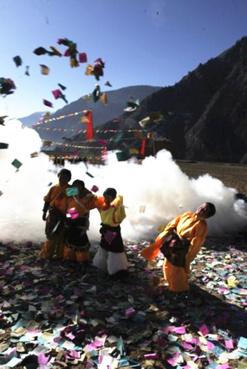 正午時分,村里的小伙子身著節(jié)日盛裝,手持木刀、木劍,肩扛松星到神山去祭山神,將木刀、木劍和松星插在神塔上,他們認為這樣做就可以全副武裝山神了,任何妖魔鬼怪都不敢來侵擾村莊了。小伙子們在神塔旁邊點燃柏枝,撒上青稞酒、糌粑、酥油、茶葉、大米等,然后圍著白塔轉(zhuǎn)經(jīng),呼喚著各種動物的名字,喇嘛在一旁齊聲祈福。新龍人特別注重過十三節(jié),所有讓人興奮的娛樂活動都會在十三這天下午在村子里隆重上演,村民不僅是各種娛樂活動的參與者,更是最忠實的觀看者。