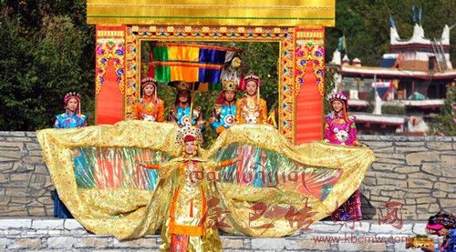 在催人奮進(jìn)的戰(zhàn)鼓聲中,一群身披甲胄的士兵拿著長劍,背著巨弓走到臺(tái)前,在鏗鏘的戰(zhàn)鼓聲中,戰(zhàn)士們做著各種競技動(dòng)作,模仿武士們互相攻擊的樣子,那矯健的身影展示了遠(yuǎn)古時(shí)代嘉絨藏族先民們?yōu)榱松媾c自然努力抗?fàn)幍膱鼍啊_^了一會(huì)兒音樂一轉(zhuǎn),戰(zhàn)鼓聲漸漸減弱,在鳥雀的陣陣啾啾聲中,一座木門慢慢的開啟,一位身披長袍、頭戴鳳冠的女王在眾多美女的簇?fù)硐拢従徸呦屡_(tái)階步入舞臺(tái)中央,此時(shí),一位手捧托盤的老者來到女王面前單膝下跪,將托盤高舉過頂,并邀請女王品嘗佳肴,女王將中指在酒中蘸了蘸,并曲起中指向四周輕輕彈去,寓意愿將杯中美酒與四方百姓同飲。在女王面前還放置著一個(gè)凈水桶,桶中盛滿了清澈的甘泉,桶上橫放著一枝柏樹枝,女王伸出纖纖玉手,拿著柏樹枝在水中蘸了蘸,面向墨爾多神山撒去,寓意向神山祈福。這是此次《美人谷·丹巴》節(jié)目展演中的序曲部分,有著強(qiáng)烈的東女神韻,將遠(yuǎn)古時(shí)代東女國女王遺風(fēng)展演的淋漓盡致。