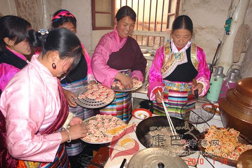 巴塘人一年當(dāng)中有很多重要的節(jié)日,而最重要的莫過于過春節(jié)。隨著農(nóng)歷新年的來臨,巴塘人過春節(jié)的氛圍也越來越濃烈了。掃塵、貼春聯(lián)、殺年豬、罐血腸、樹經(jīng)幡、獻(xiàn)“切瑪” 、曬牛肉干、做長面、炸“花茹” 、 釀青稞酒等等,人們臉上綻放出春天的笑顏,喜逐顏開迎候新春佳節(jié)的到來。而在眾多的風(fēng)味飲食中,炸“花茹” 、 吃長面(當(dāng)?shù)厝朔Q之為“金絲面”)是巴塘人春節(jié)時家筵中必不可缺的美食佳肴。